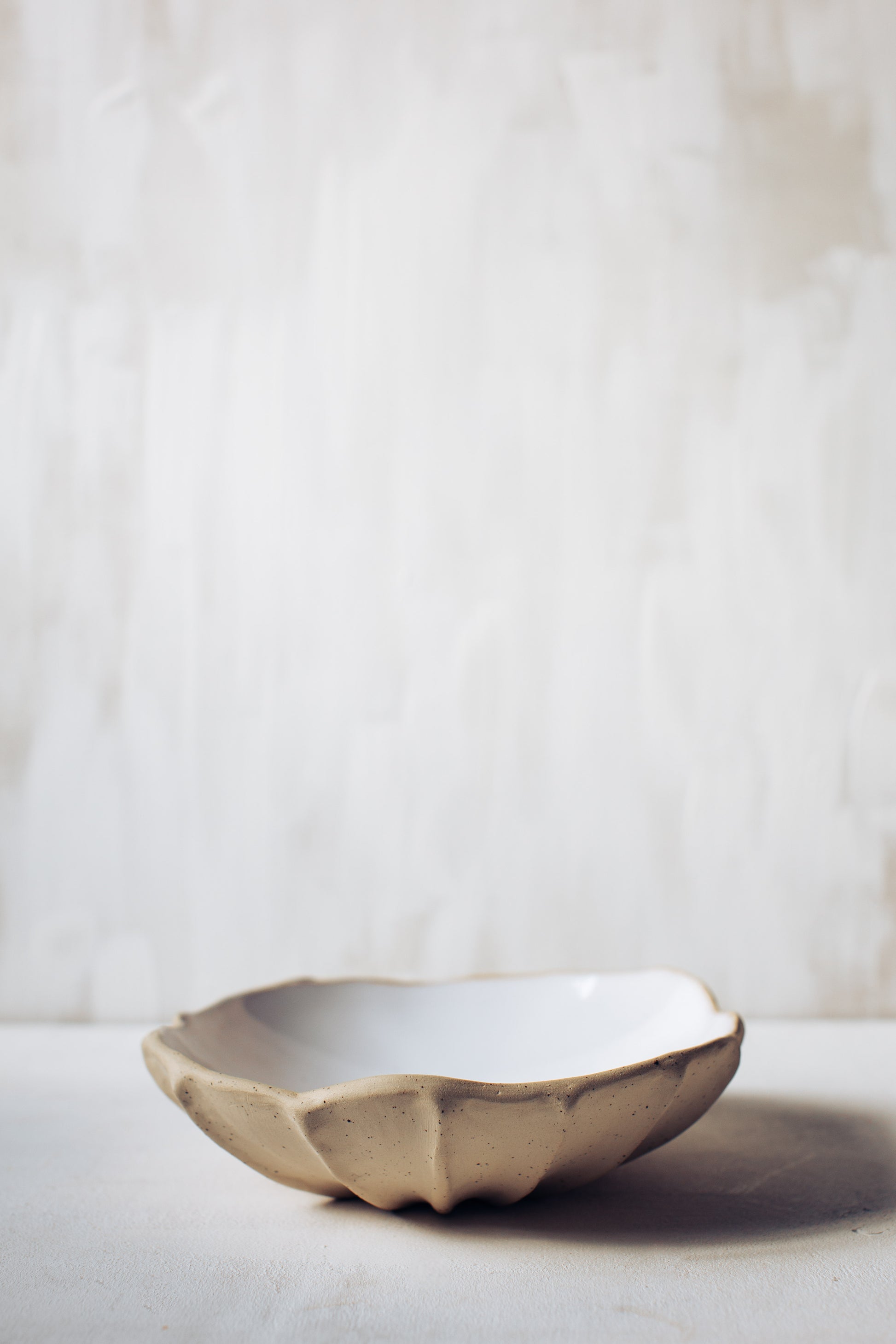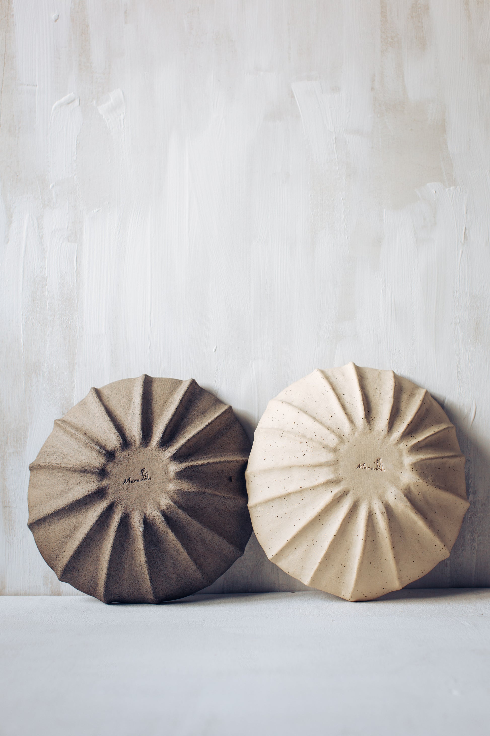 🥣 ITEM DESCRIPTION: Concrete gray / sandy stoneware clay , white glossy glaze inside. Fully hand-made thus the dimension and the shape vary - 24-26cm in diameter, 7-9cm height. This product is dishwasher, microwave and food safe.