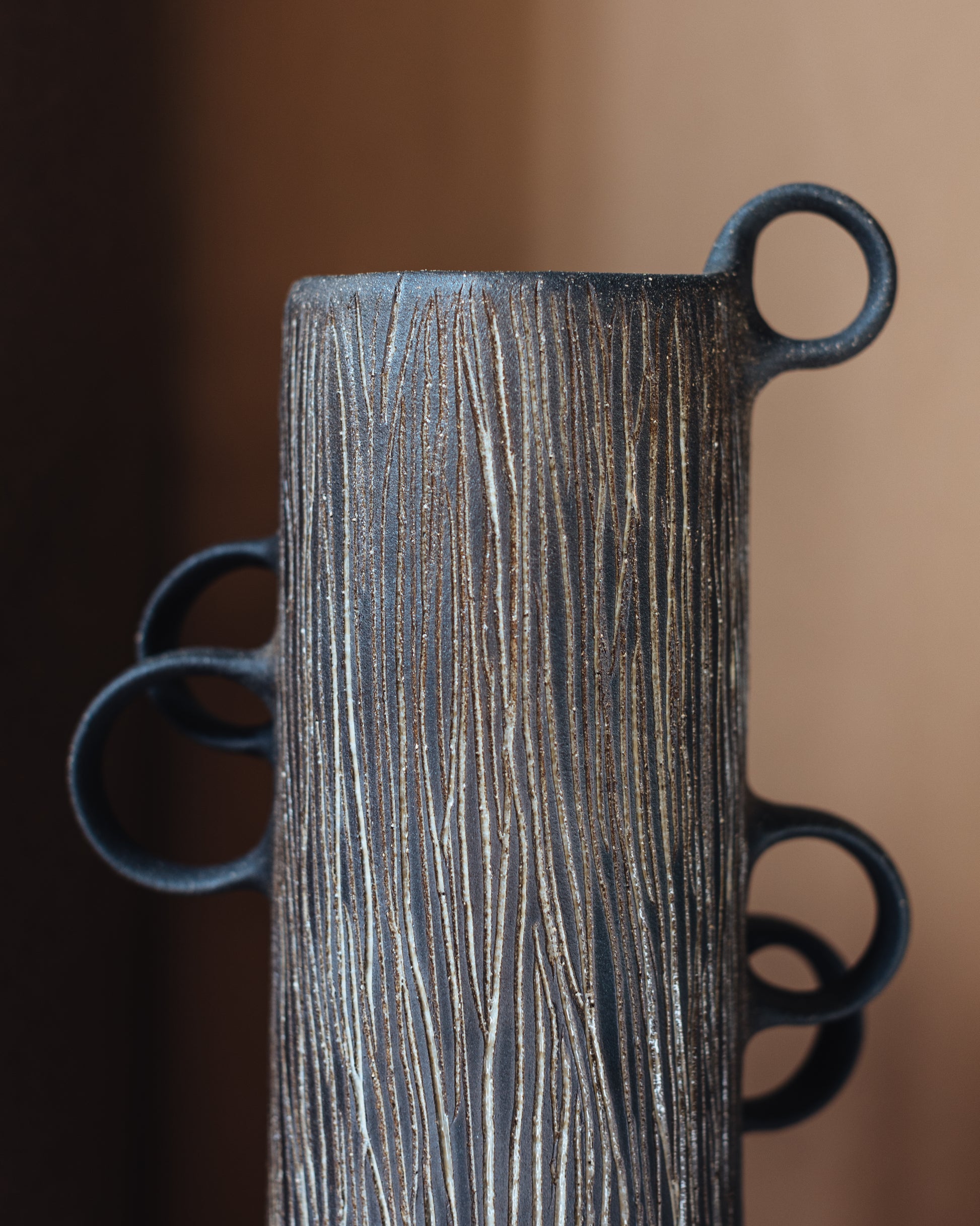 🥣 ITEM DESCRIPTION: Black stoneware . Transparent glaze inside. Individually surfaced. This product is dishwasher, microwave and food safe. Perfect for tiny bouquets. Height 25.5cm.