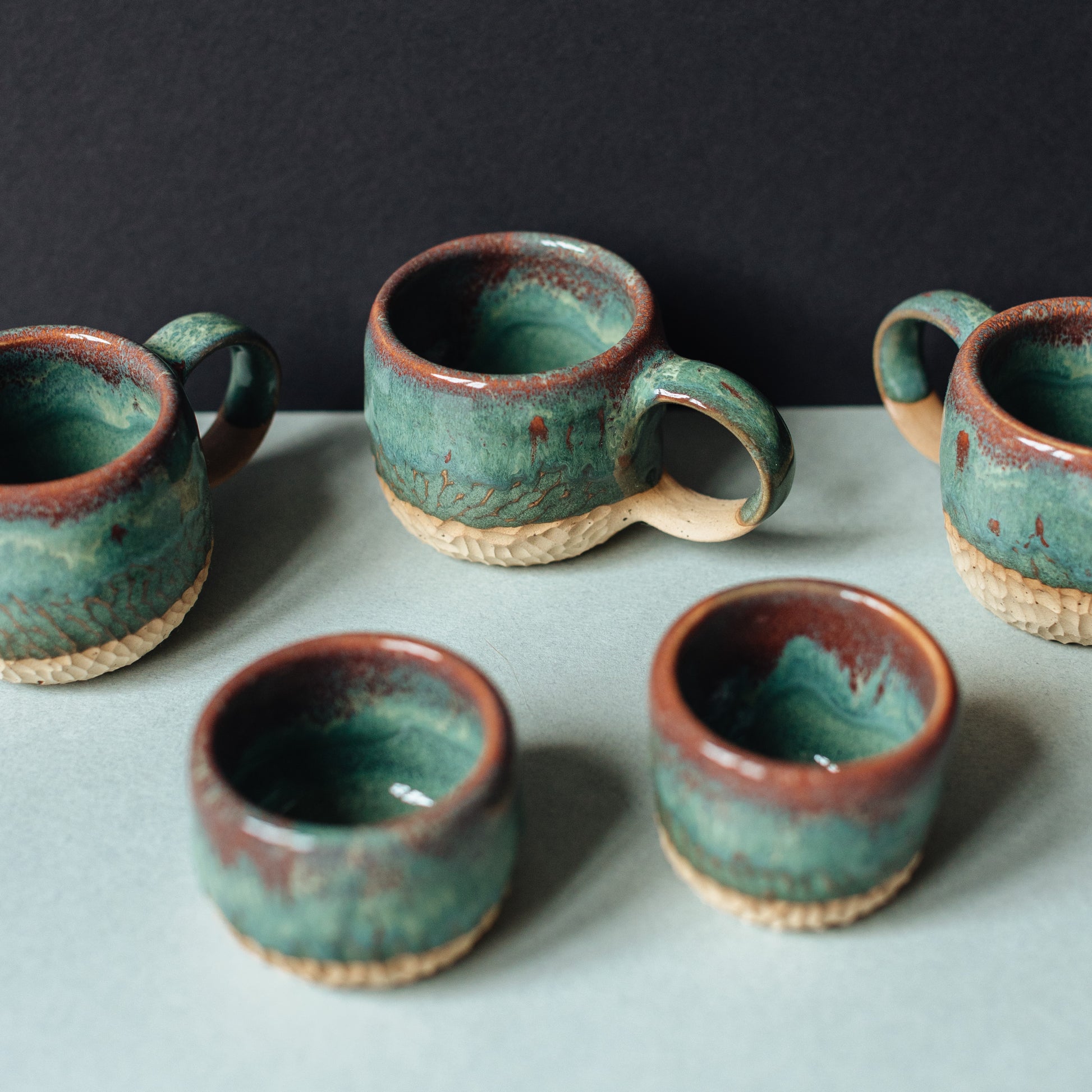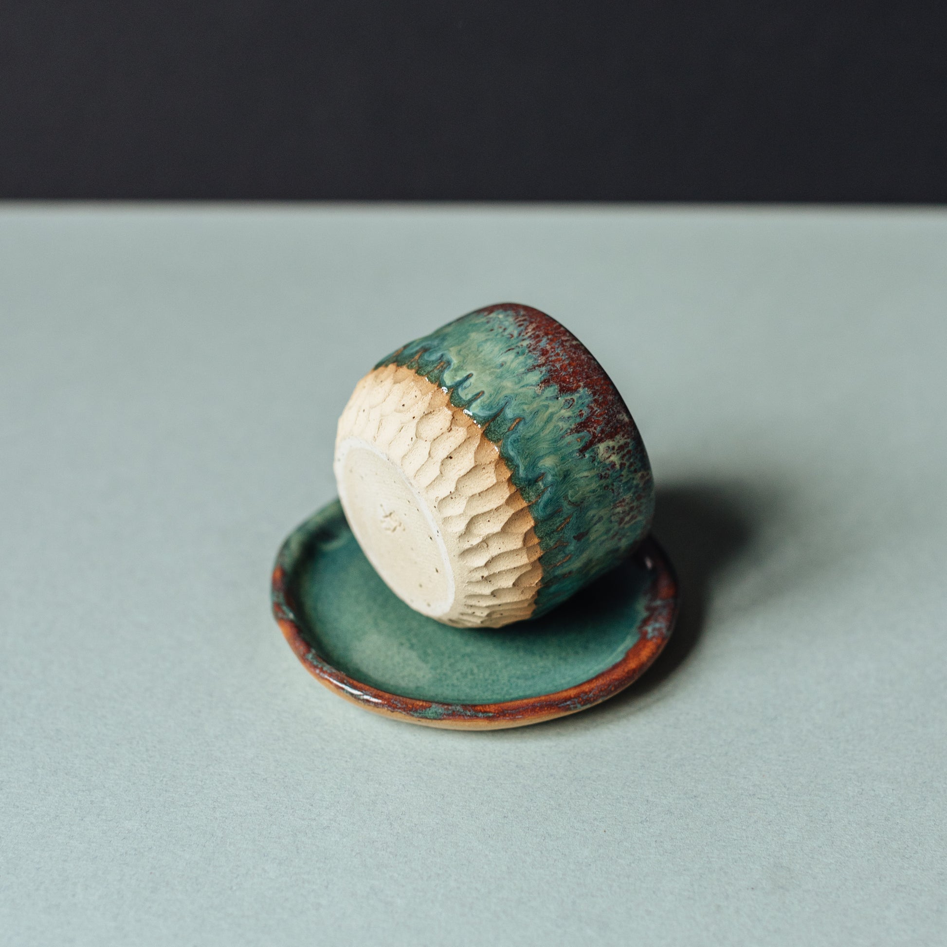 🥣 ITEM DESCRIPTION: Sandy stoneware clay with speckles. Green glaze with brown edge outside. Wheel-thrown cup 50ml. This product is dishwasher, microwave and food safe.