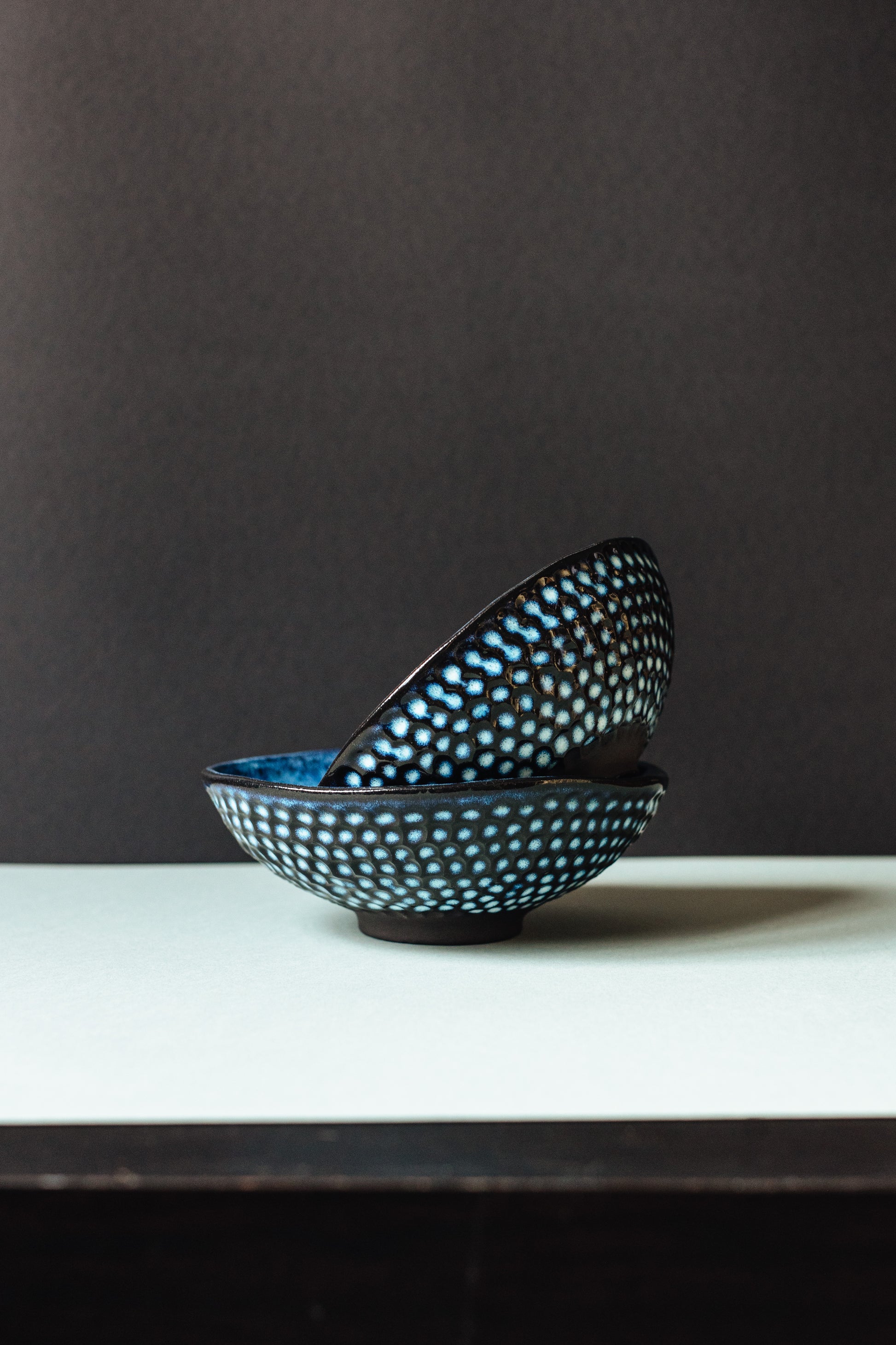 🥣 ITEM DESCRIPTION: Black stoneware, blue glaze. The shape is 18cm in diameter, 7cm tall. This product is dishwasher, microwave and food safe.