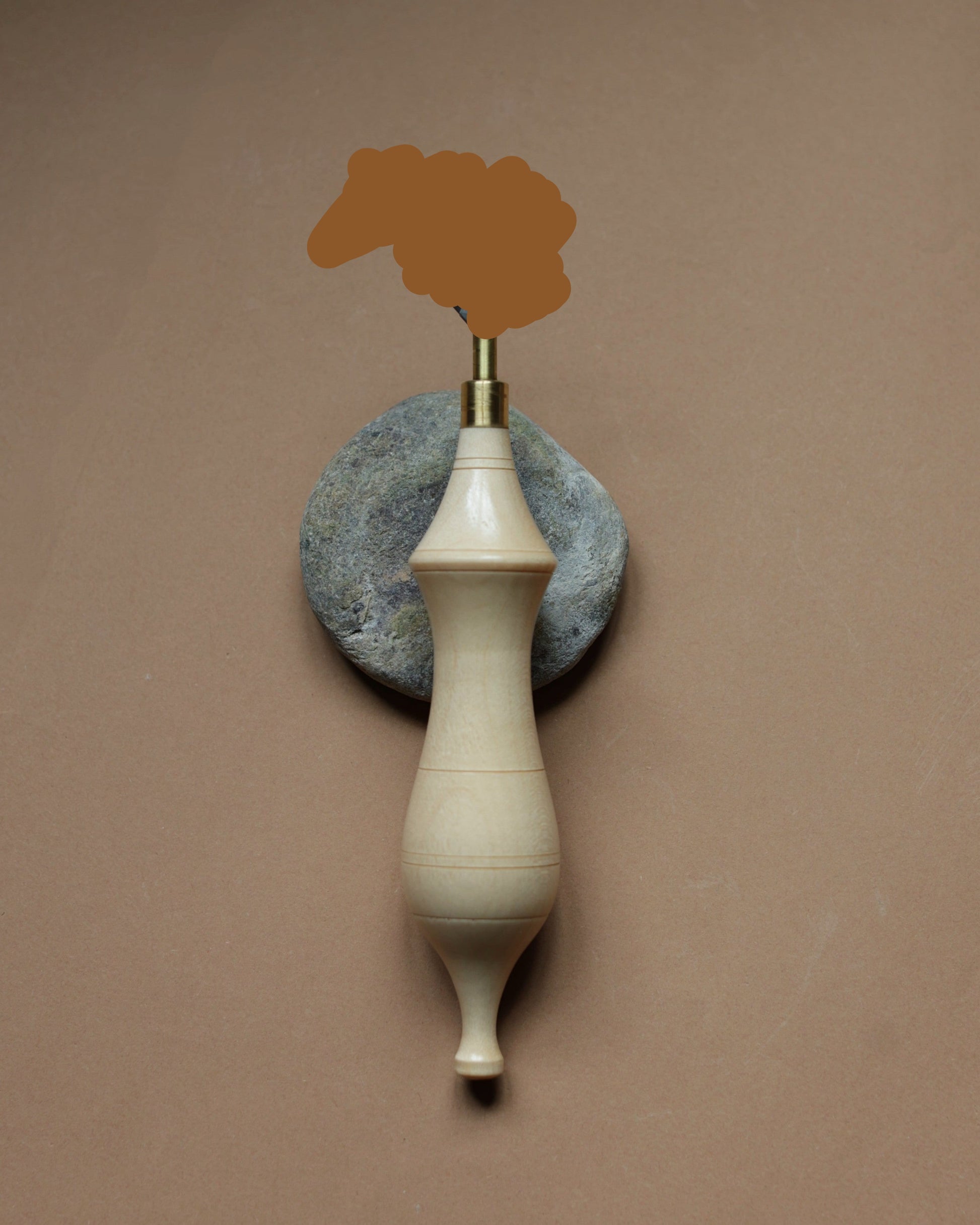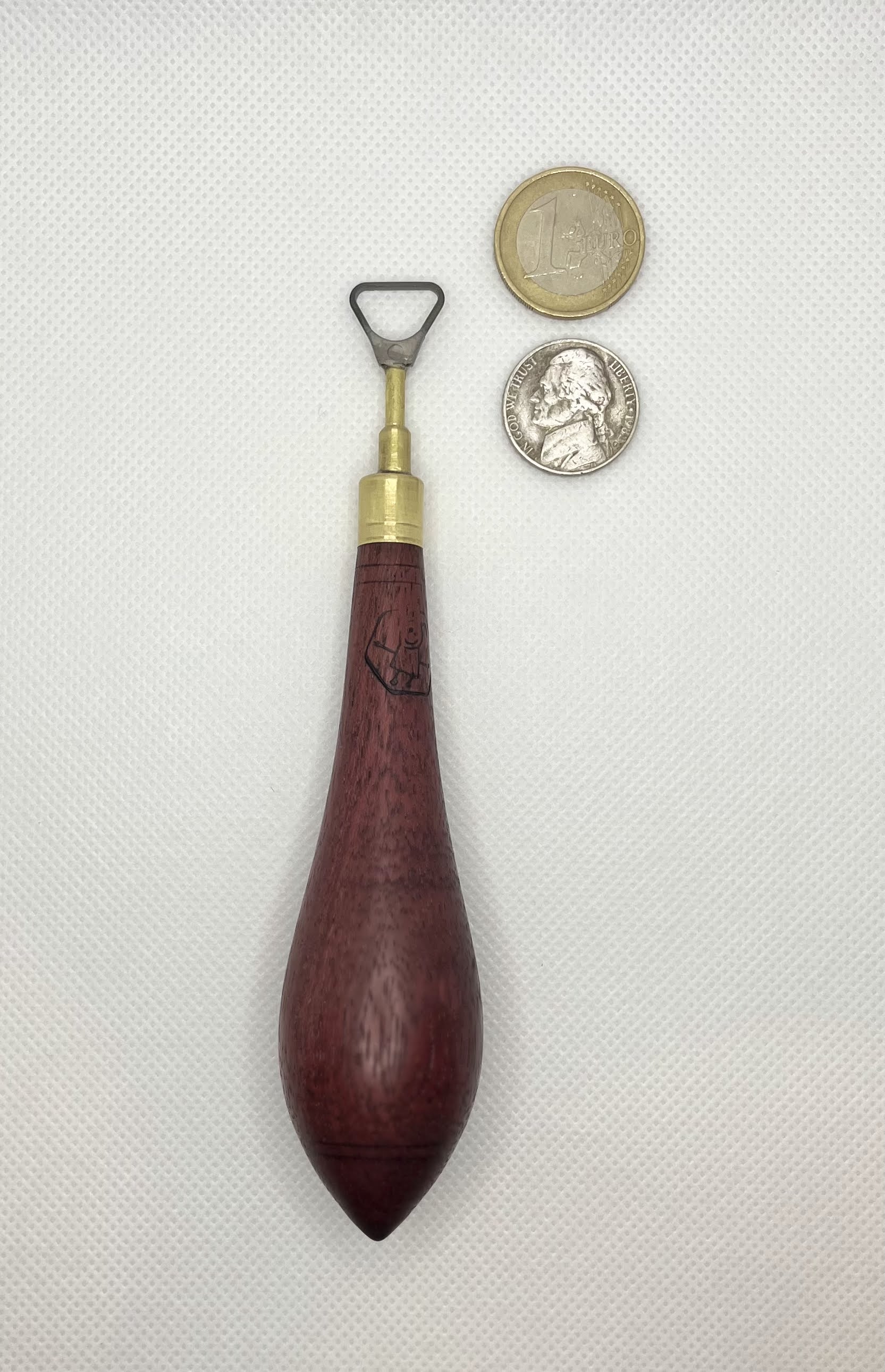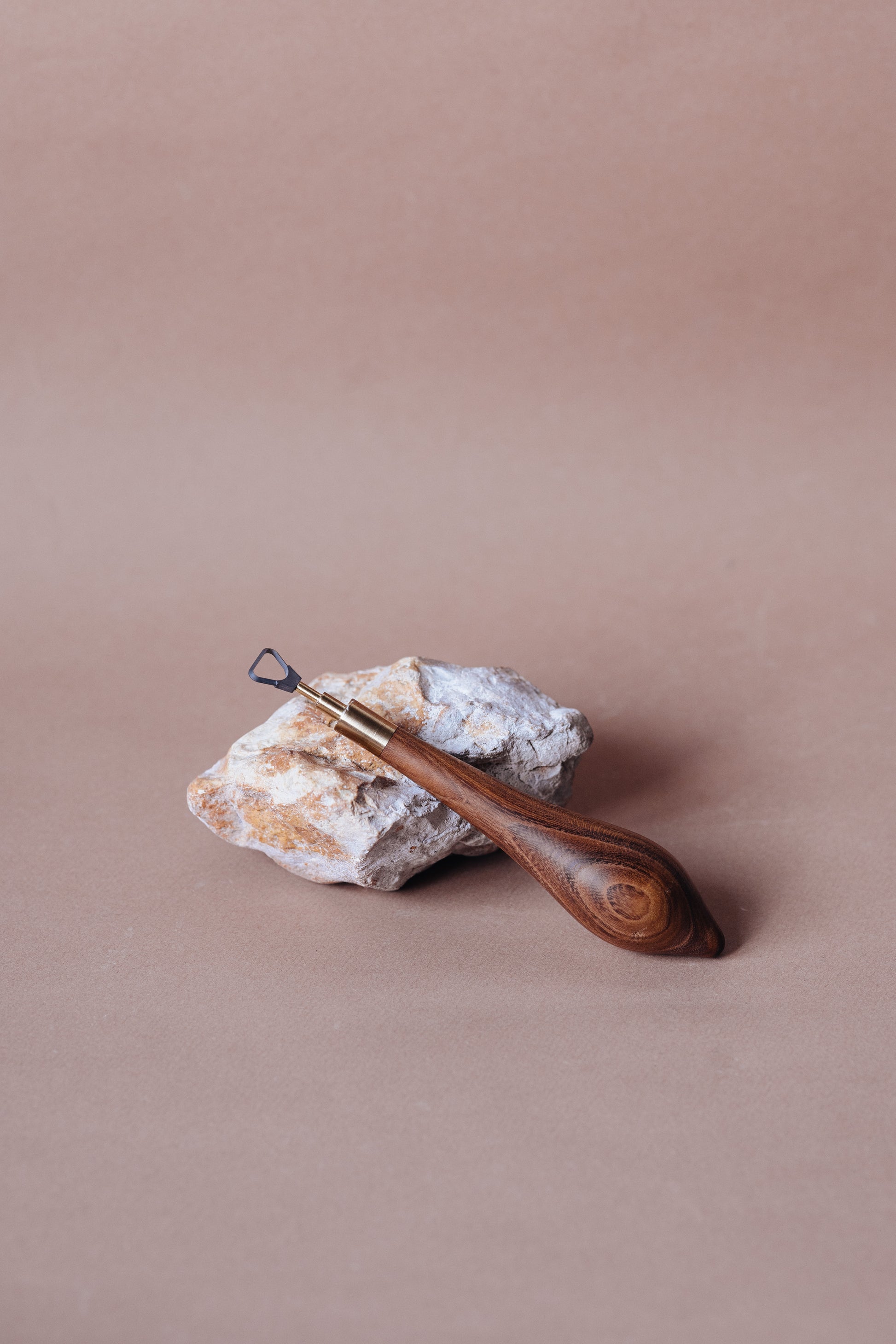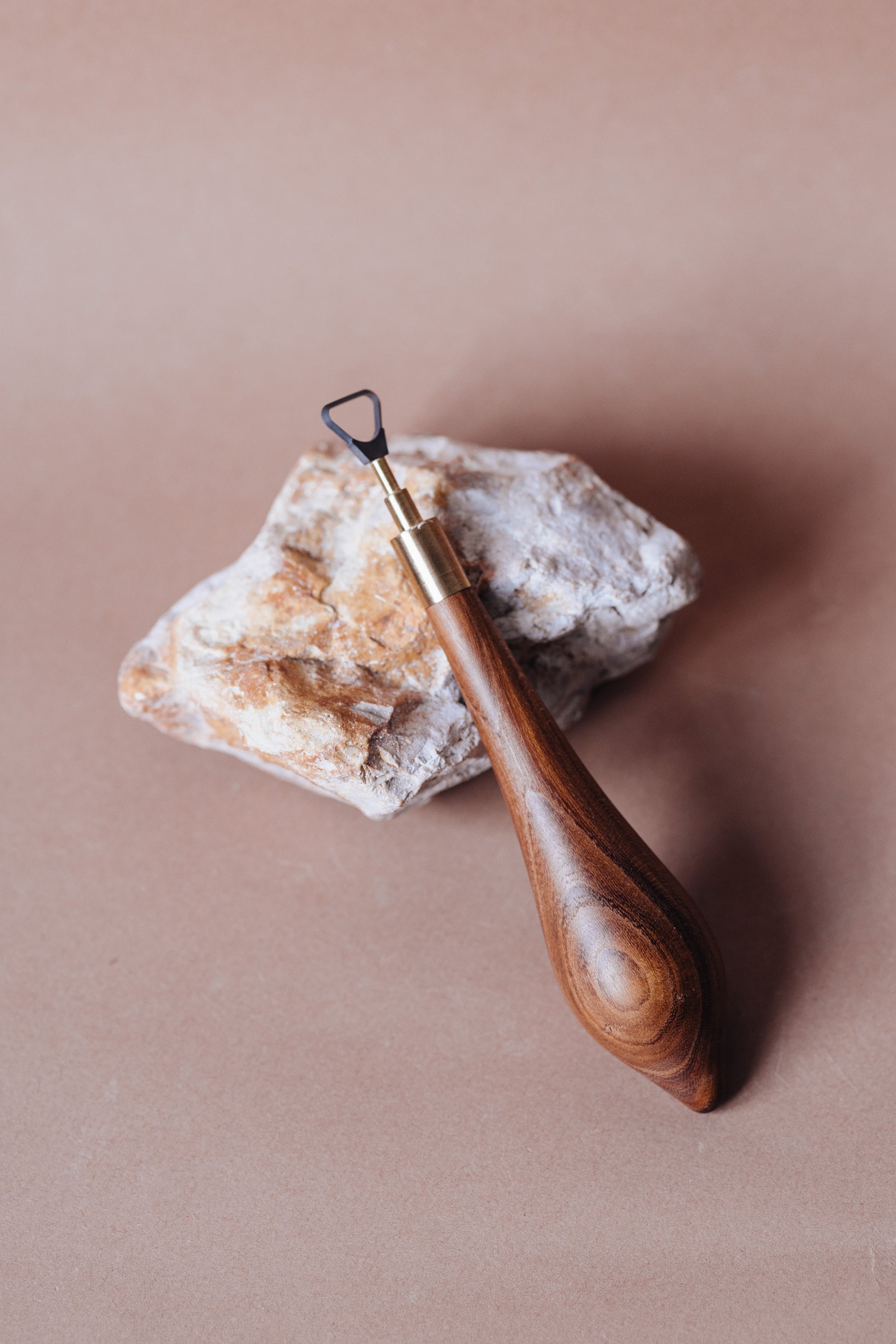 The Merenok Pottery Tools' trimming instrument features a cutting loop crafted from tungsten carbide, a brass neck, and a wooden handle coated with a protective oil.