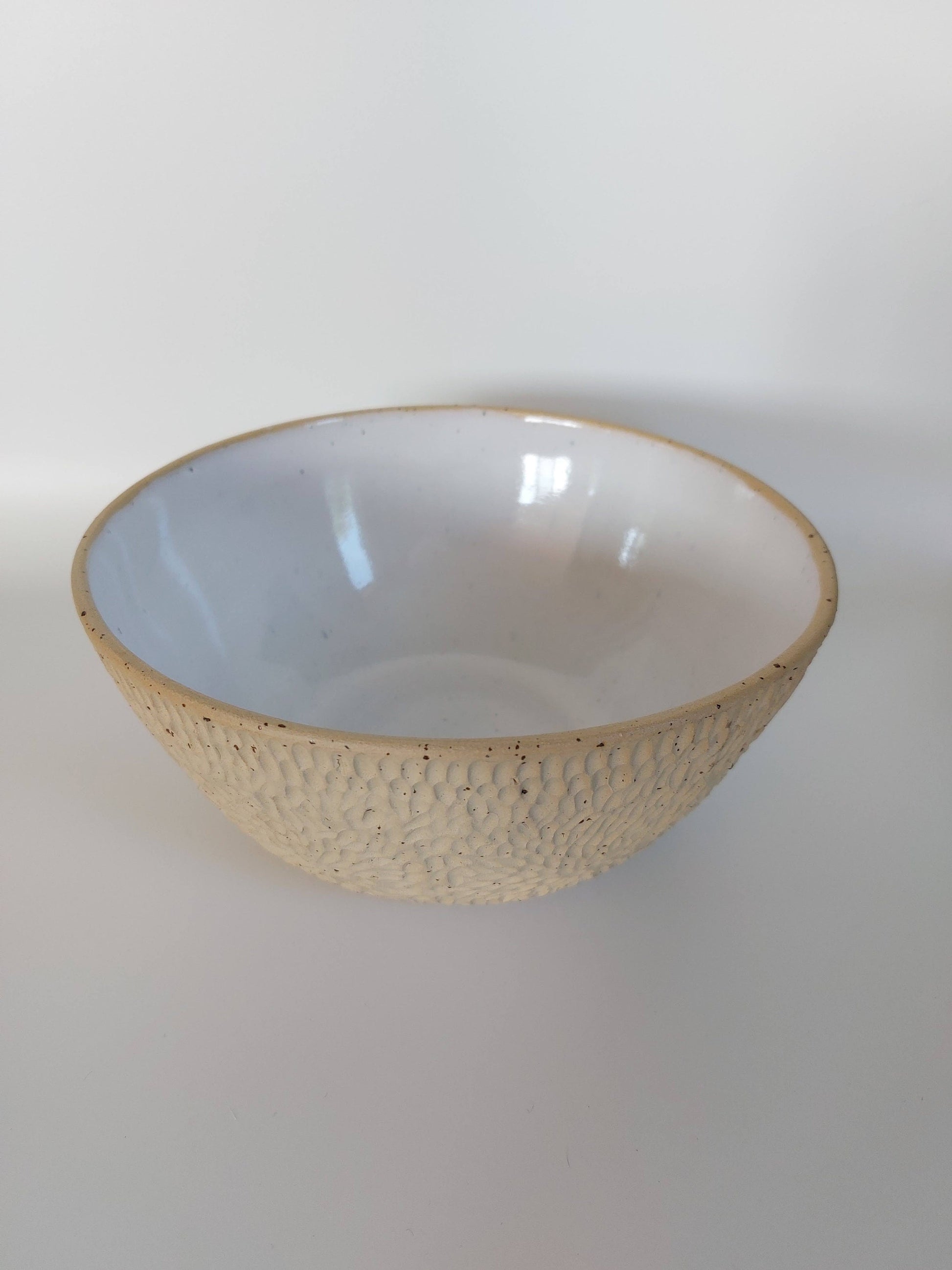 🥣 ITEM DESCRIPTION: Sandy stoneware clay with speckles, white glossy glaze inside. Fully hand-made . The shape is 20 cm in diameter, 10 cm height. This product is dishwasher, microwave and food safe.