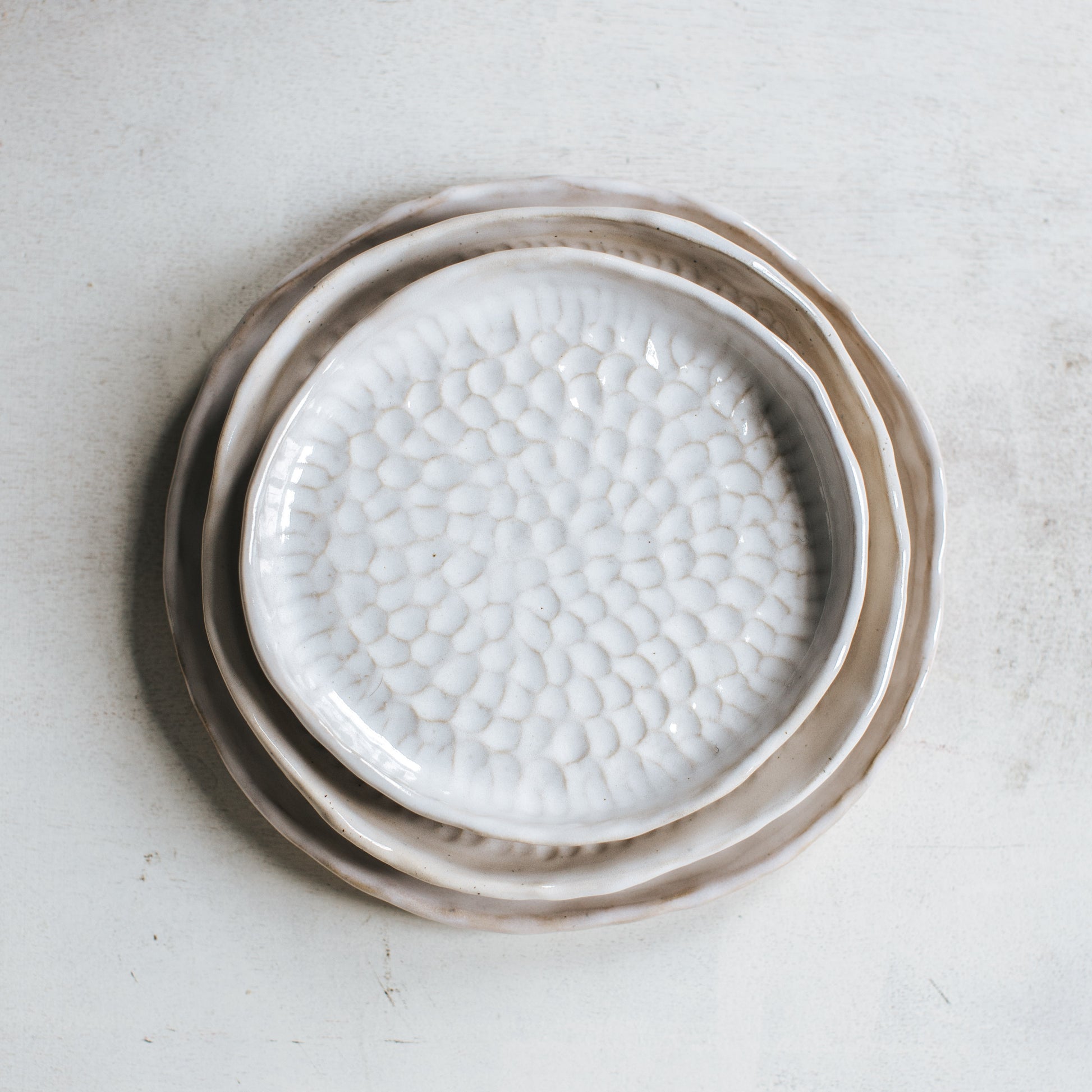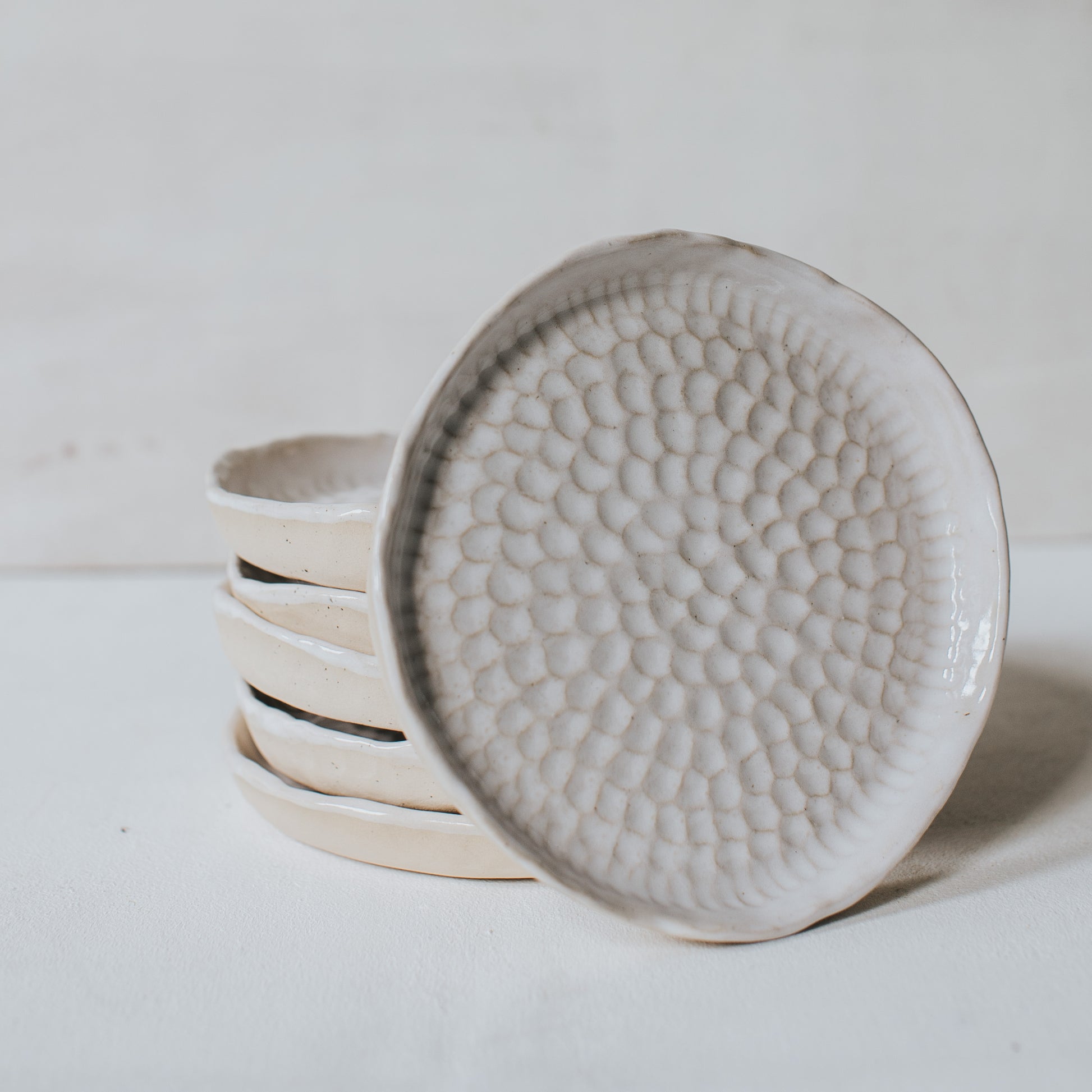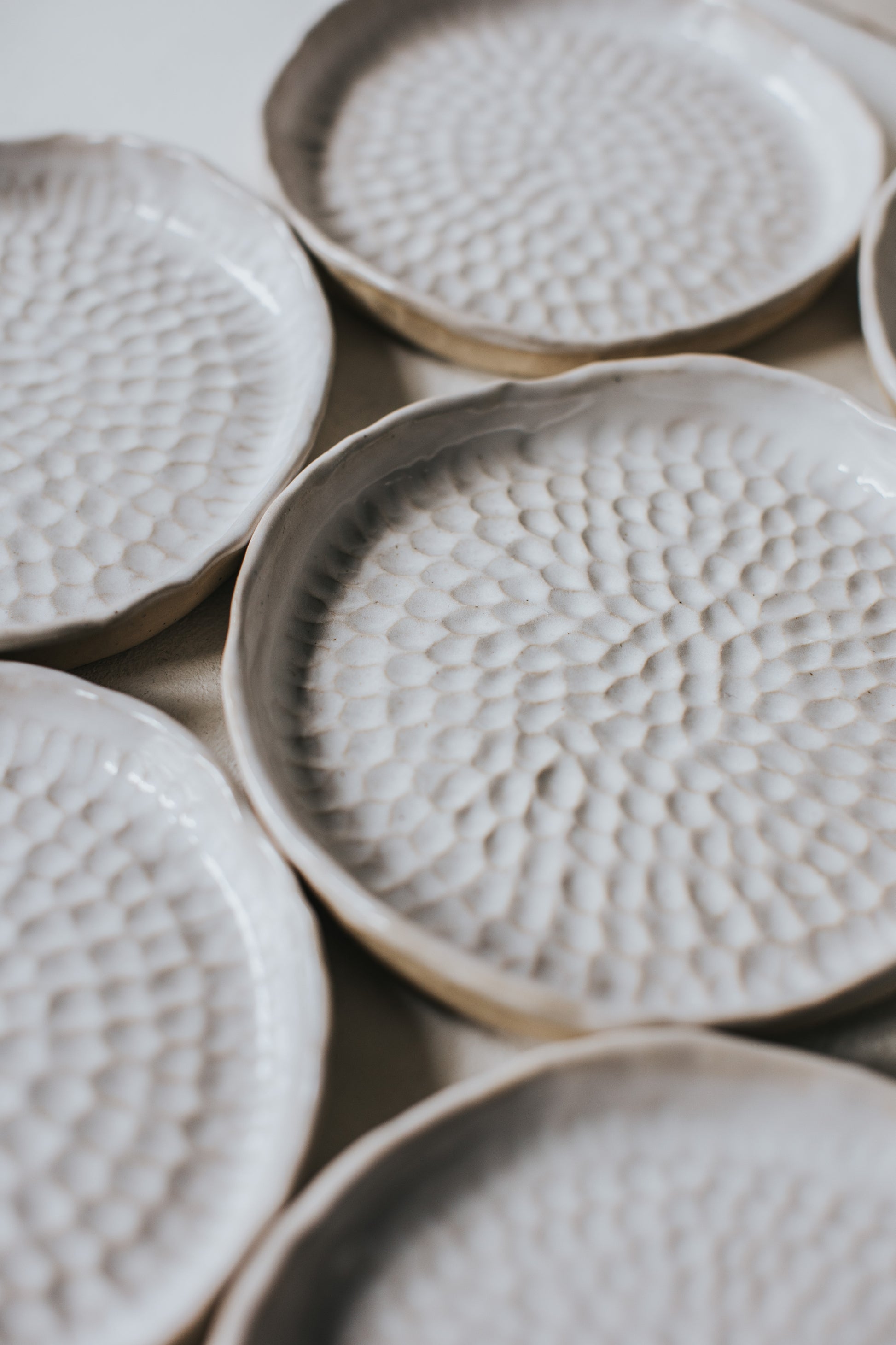 🥣 ITEM DESCRIPTION: The plates are fully hand made out of sandy speckled stoneware then individually textured. Warm-white glossy glaze on the surface and the rim. Every plate has unique pattern and shape (not always perfectly circular).