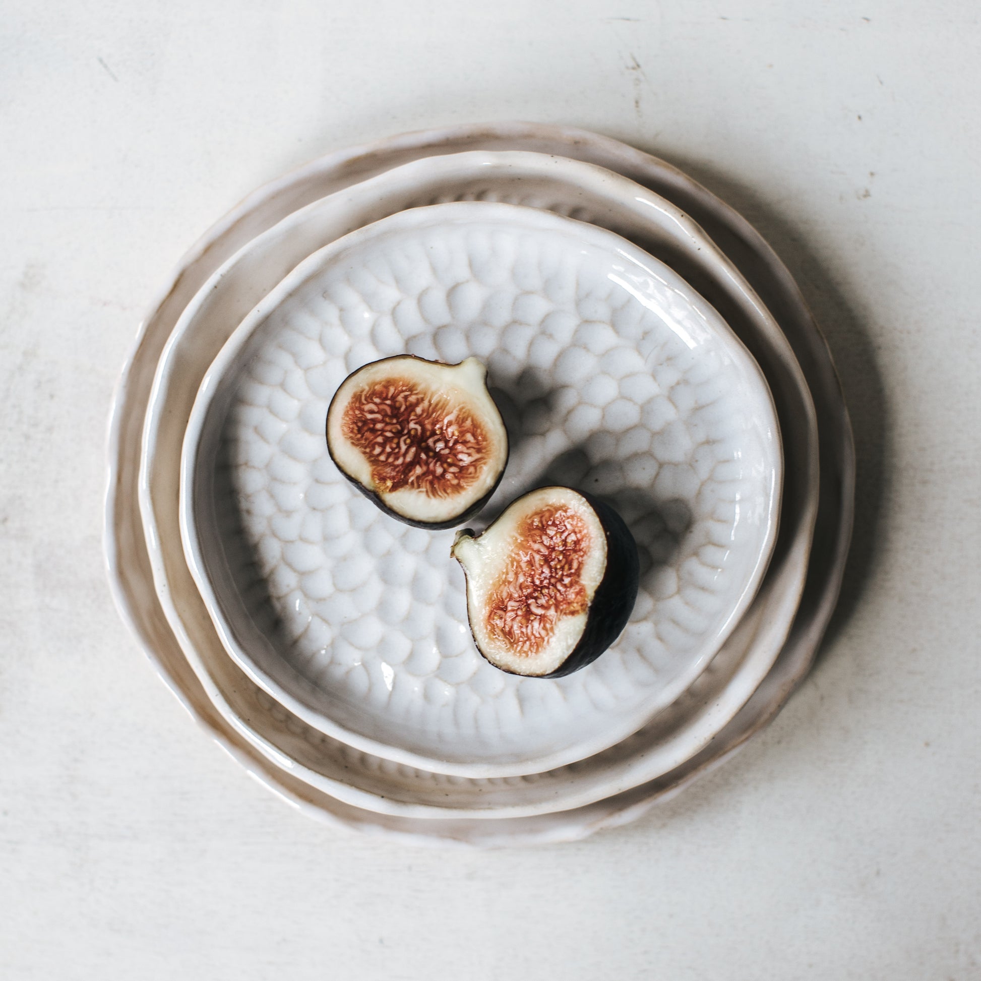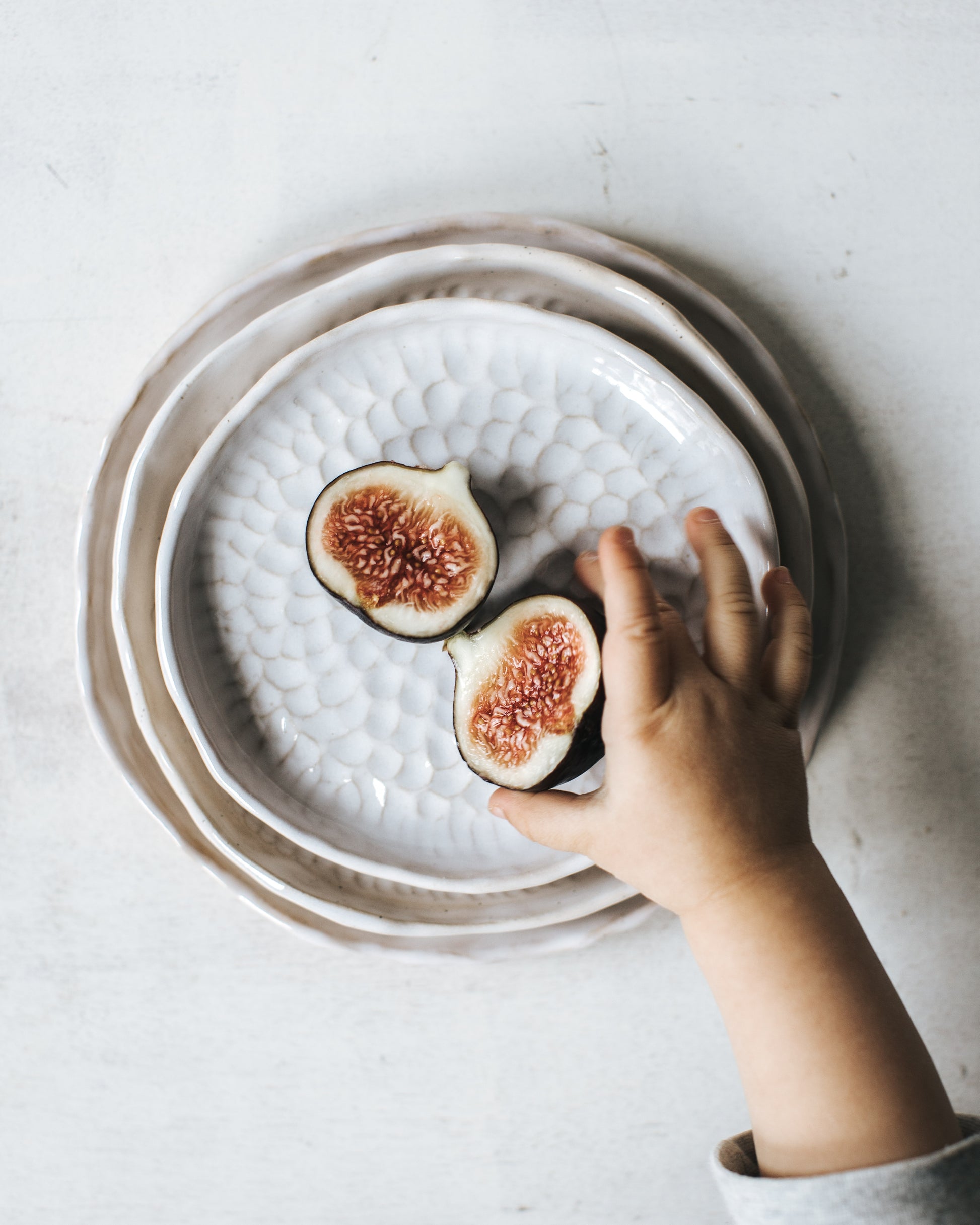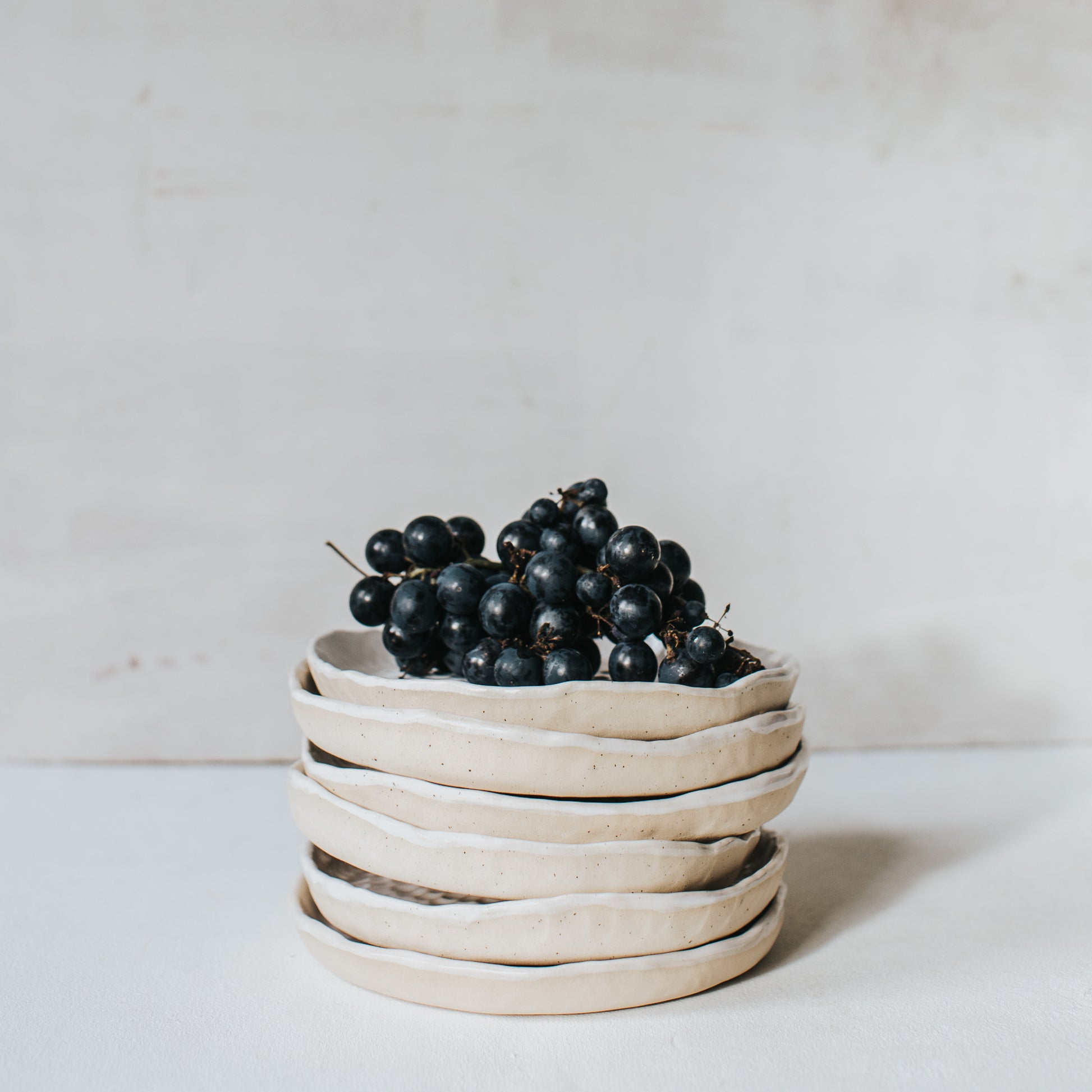 🥣 ITEM DESCRIPTION: The plates are fully hand made out of sandy speckled stoneware then individually textured. Warm-white glossy glaze on the surface and the rim. Every plate has unique pattern and shape (not always perfectly circular).