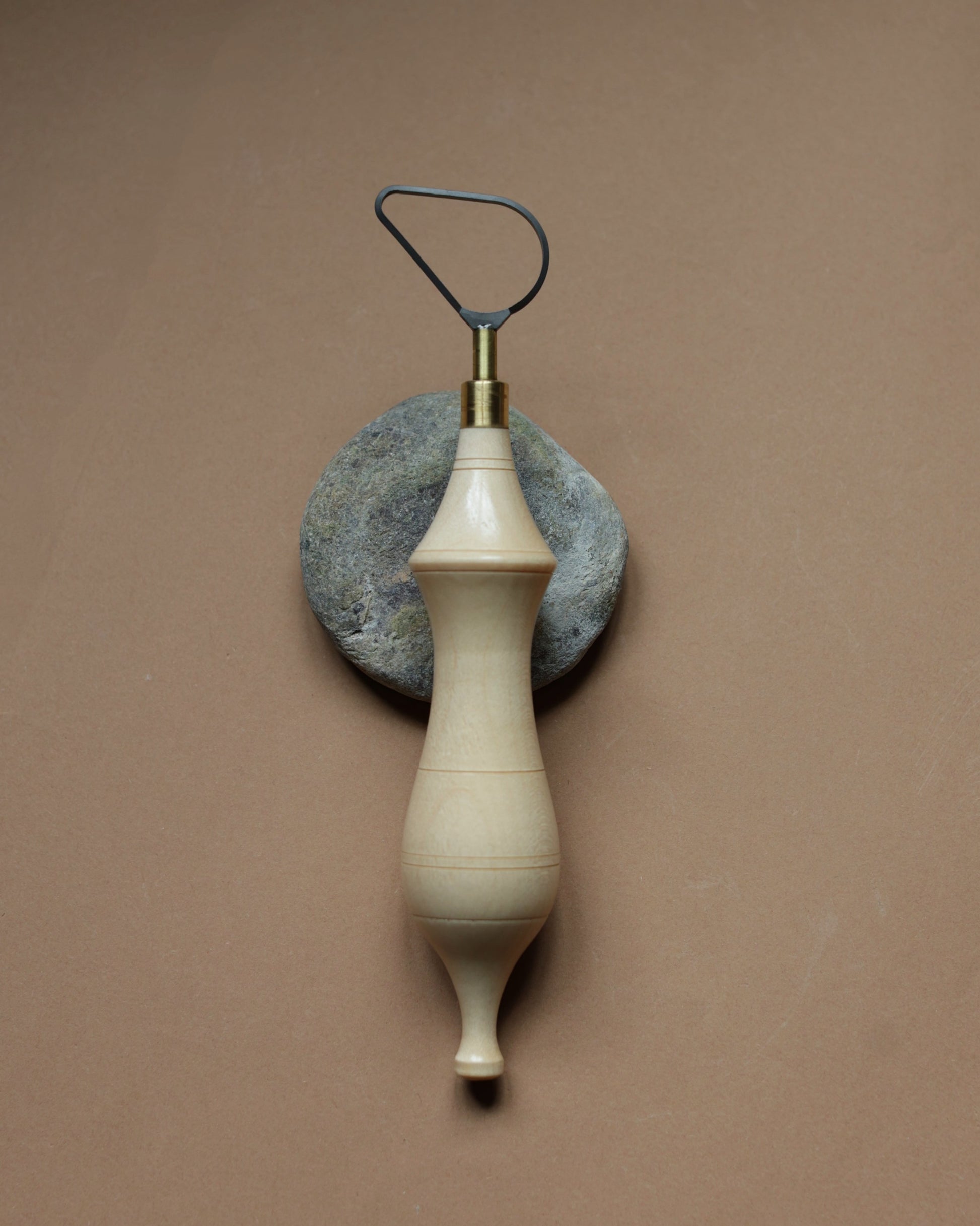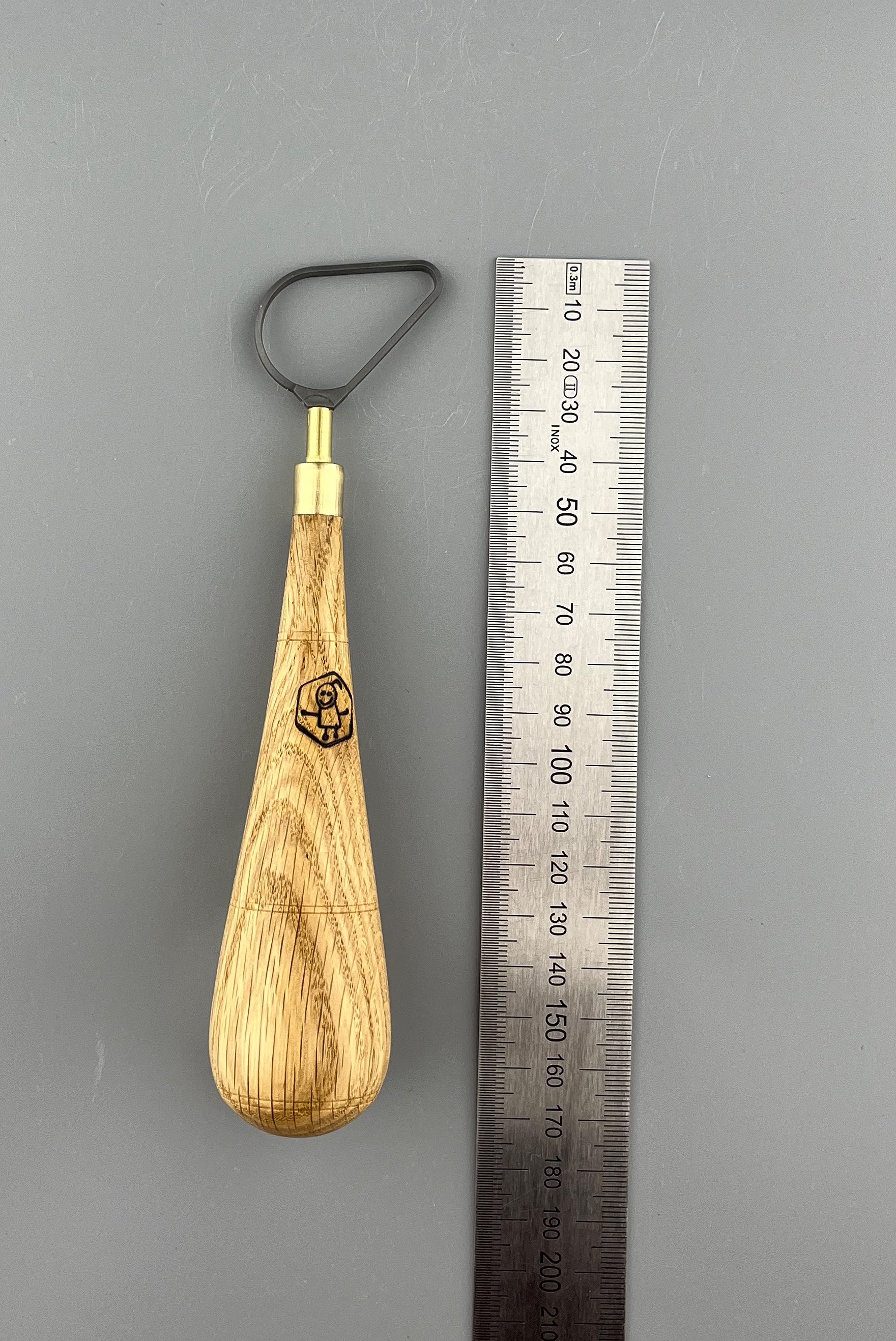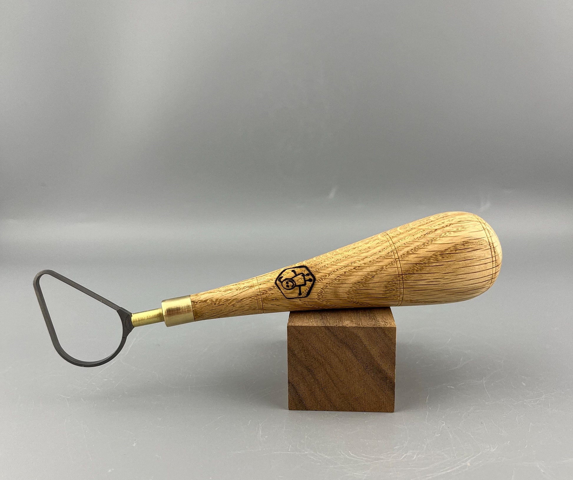 The Merenok Pottery Tools' trimming instrument features a cutting loop crafted from tungsten carbide, a brass neck, and a wooden handle coated with a protective oil.