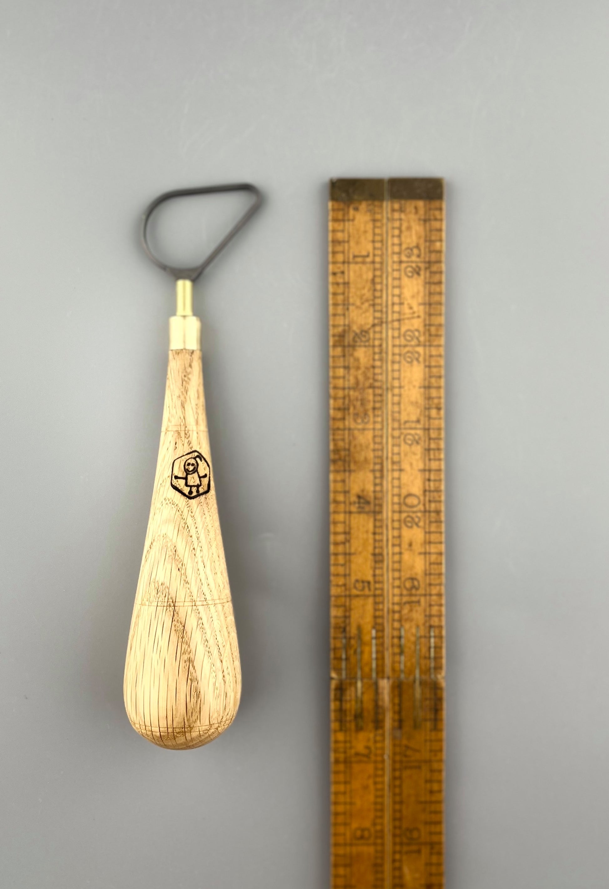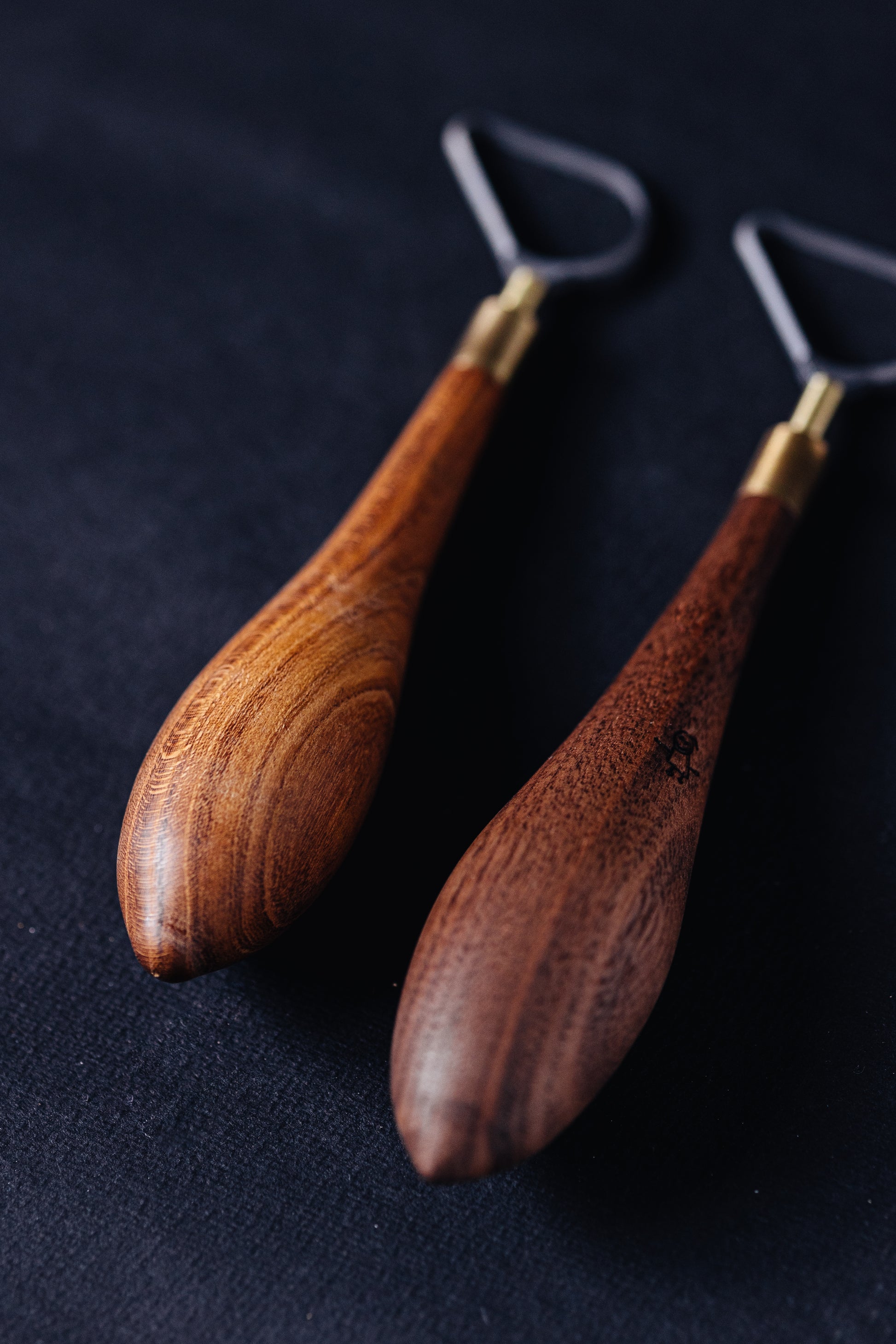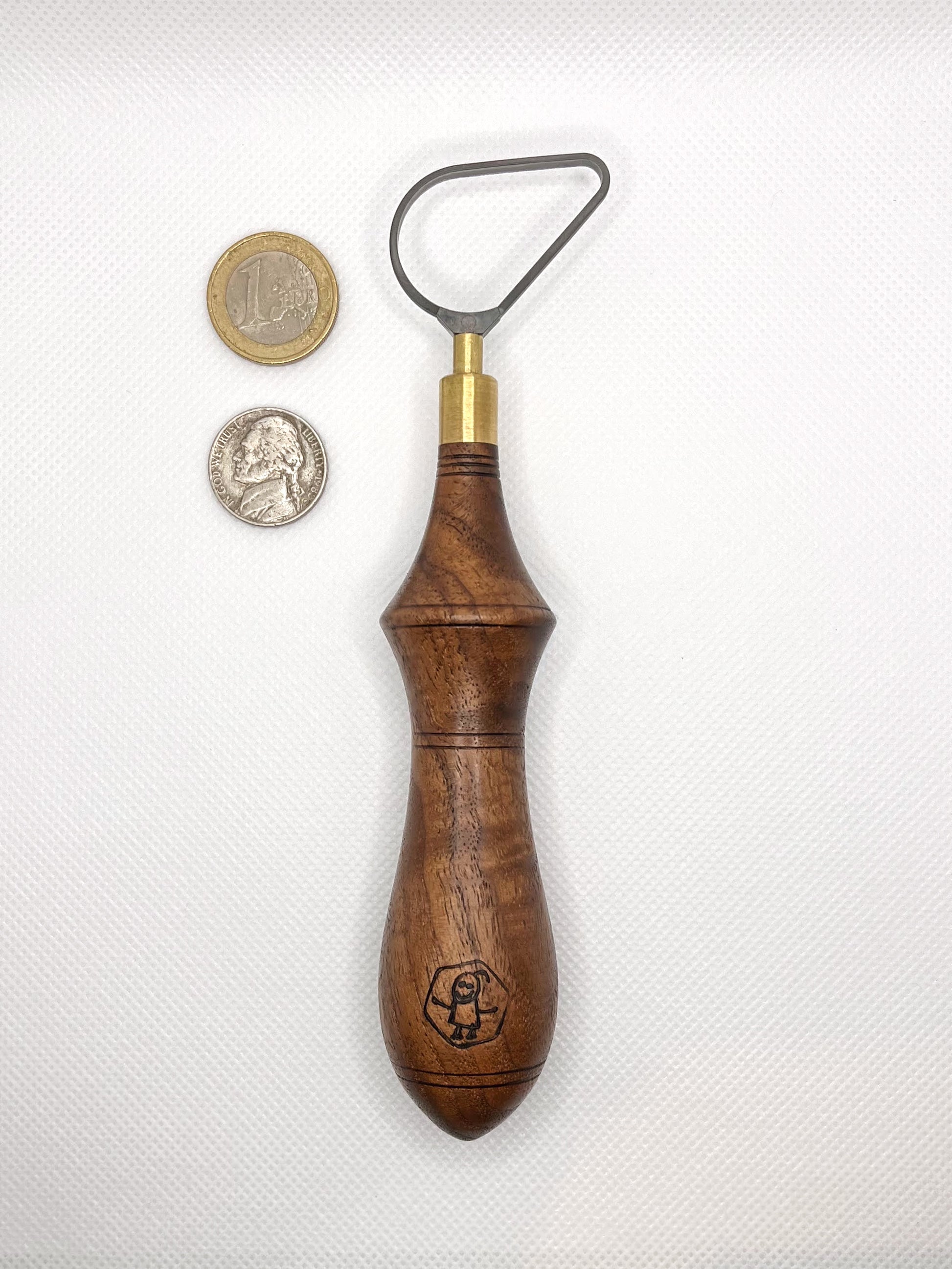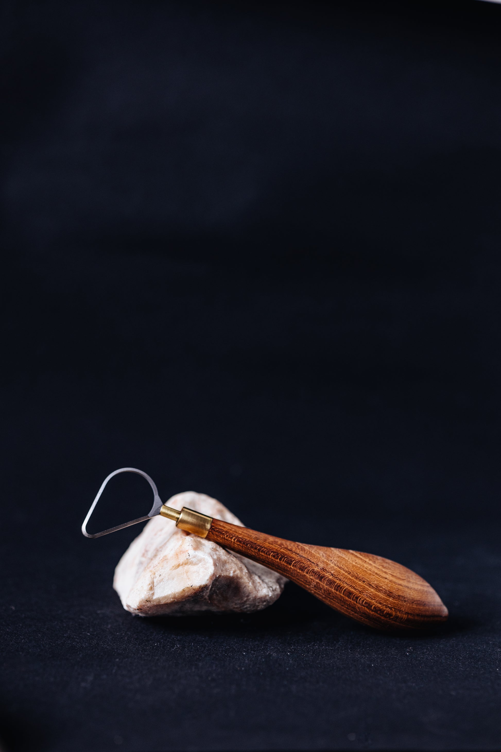 The Merenok Pottery Tools' trimming instrument features a cutting loop crafted from tungsten carbide, a brass neck, and a wooden handle coated with a protective oil.