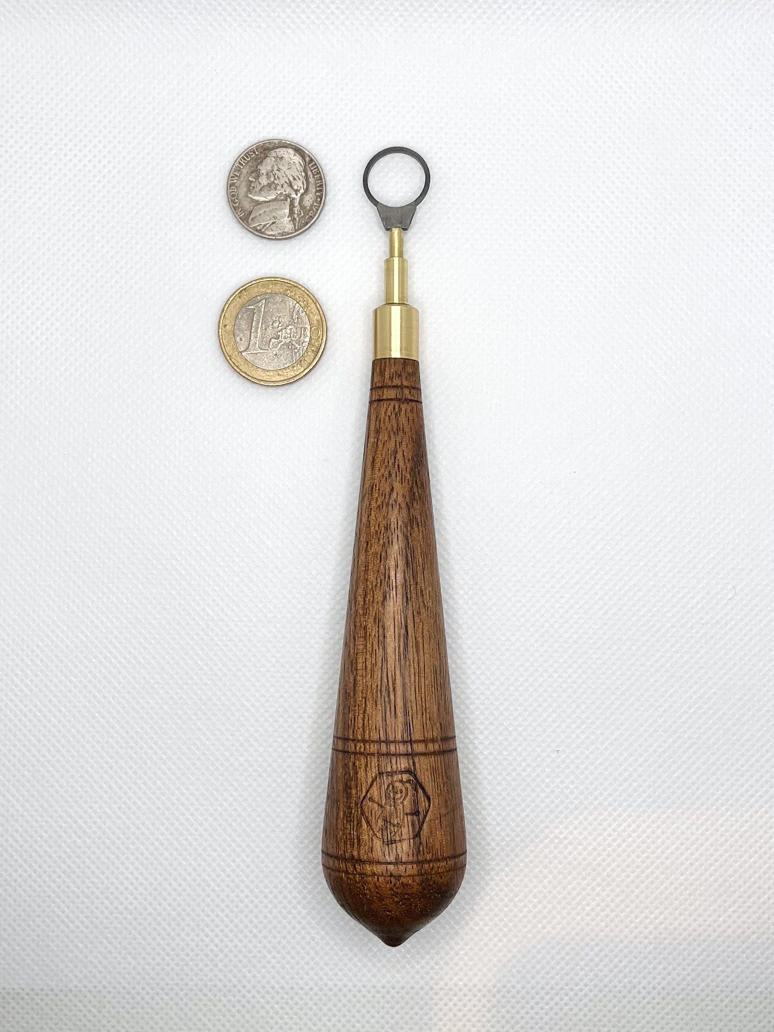 The Merenok Pottery Tools' trimming instrument features a cutting loop crafted from tungsten carbide, a brass neck, and a wooden handle coated with a protective oil.
